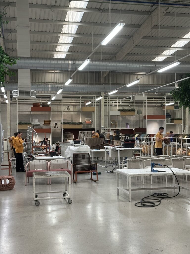 De sfeer in de fabriek was bovendien verrassend warm en uitnodigend: goede muziek op de achtergrond, veel natuurlijk licht, ruime werkplekken en natuurlijk overal de prachtige items waar Kettal zo bekend om staat.