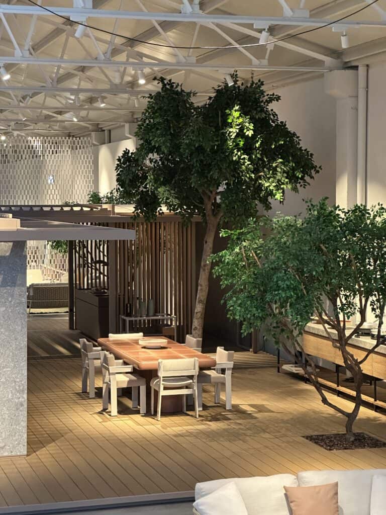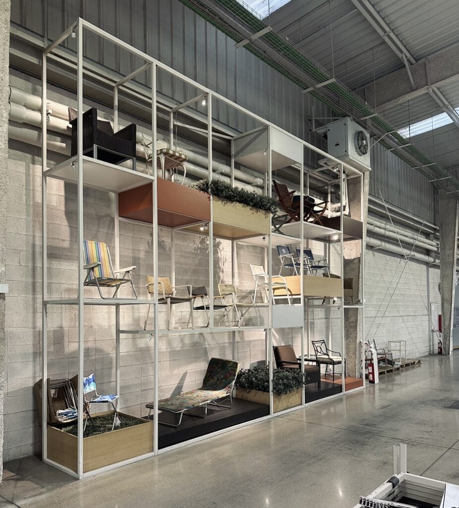 Aan één van de wanden stond in een schap een verzameling items uit de rijke historie van het merk. Ontzettend leuk om te zien hoe er in de jaren zestig buiten werd genoten op een opklapbaar stretchbedje met een vrolijk bloemenmotief. Een klein stukje nostalgie dat laat zien hoe ver buitenmeubilair inmiddels is gekomen.