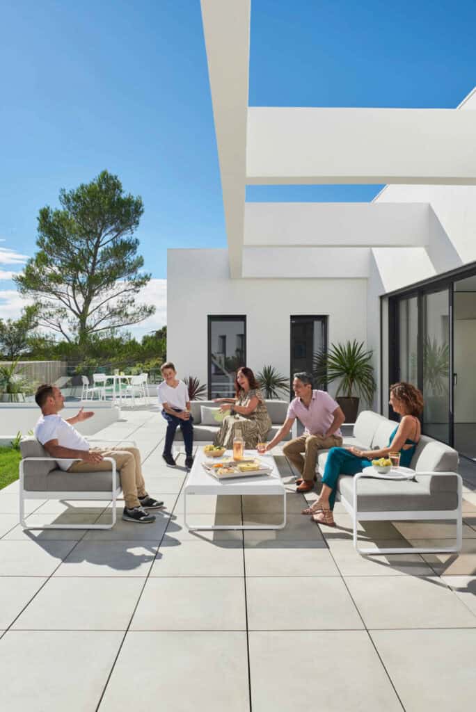 De loungeset is vaak een van de visuele middelpunten in de buitenruimte – stem kleuren en materialen af op gevel, vloer en beplanting.