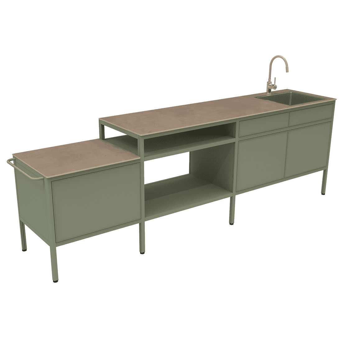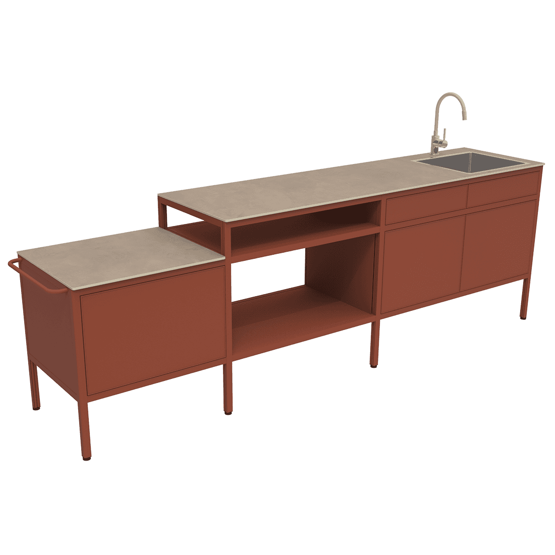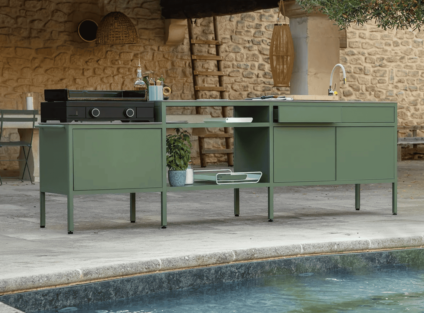 Met de Fermob Goosto buitenkeuken haal je de ultieme combinatie van design, functionaliteit en gezelligheid naar je terras of tuin. Deze buitenkeuken is dé perfecte aanvulling in het high-end outdoor segment, en sluit naadloos aan bij de trend om het comfort van binnen naar buiten door te trekken.