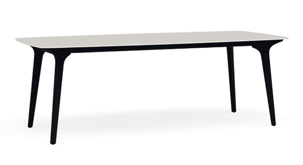 Het slanke onderstel is vervaardigd uit duurzaam teakhout en beschikbaar in twee verfijnde kleurafwerkingen: Natural Teak (warm en licht) en Teak Nero (diep zwart gebeitst teak). Voor het tafelblad kun je kiezen uit meerdere stijlvolle keramische afwerkingen, waaronder Fossil, Travertin Geo en Basalt Black. Zo pas je de tafel perfect aan op jouw buitenstijl.