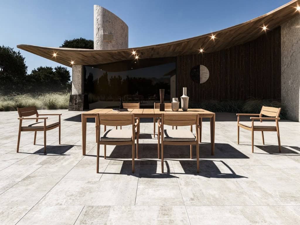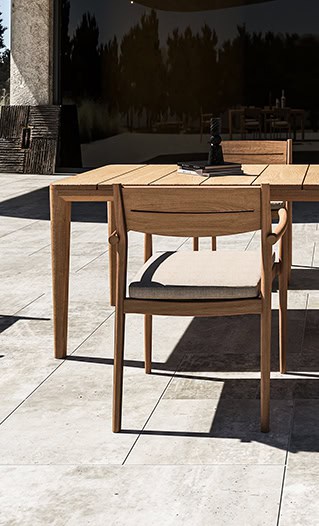 Allereerst valt het warme teakhouten frame op. Het gebruik van hoogwaardig massief teakhout zorgt niet alleen voor een natuurlijke uitstraling, maar ook voor duurzaamheid en weerbestendigheid. Hierdoor is de stoel perfect geschikt voor buitengebruik, het hele jaar door. Bovendien ontwikkelt het teak na verloop van tijd een karaktervolle zilvergrijze patina, zonder aan kwaliteit in te leveren.