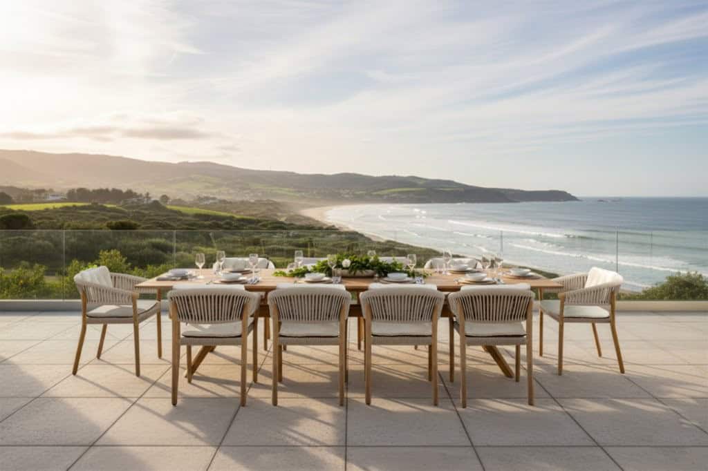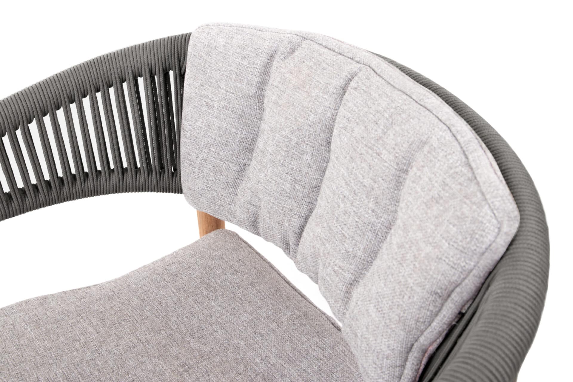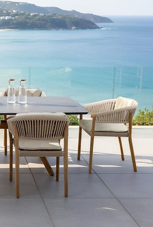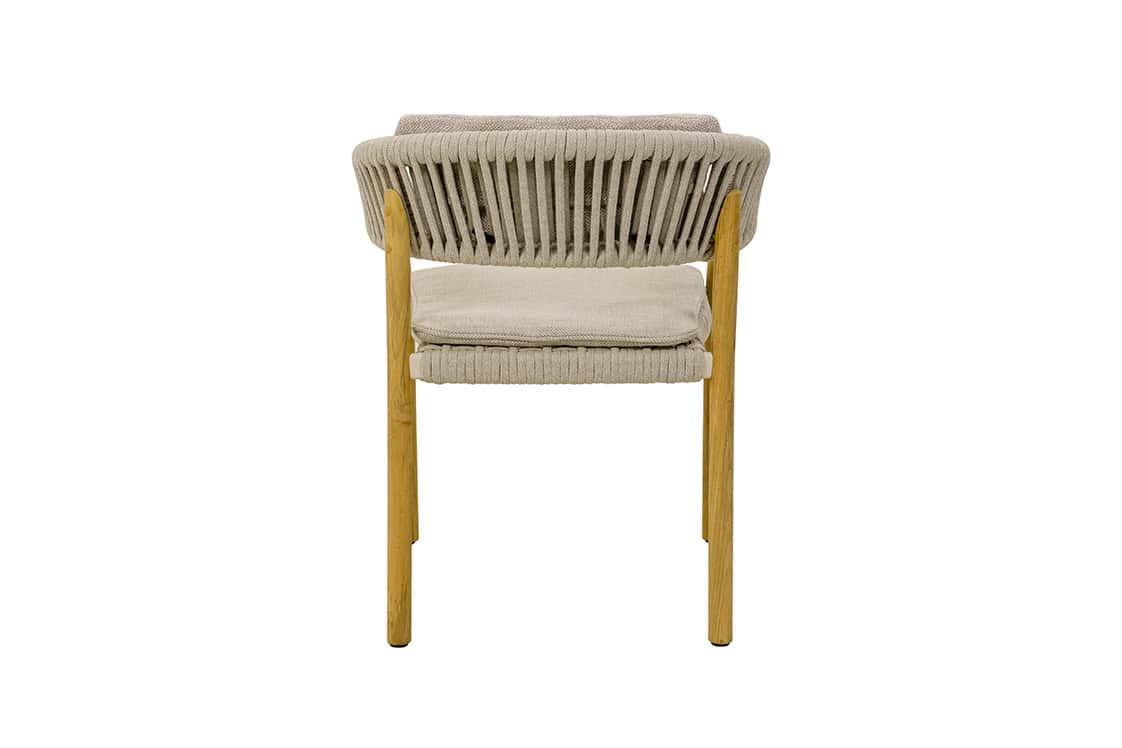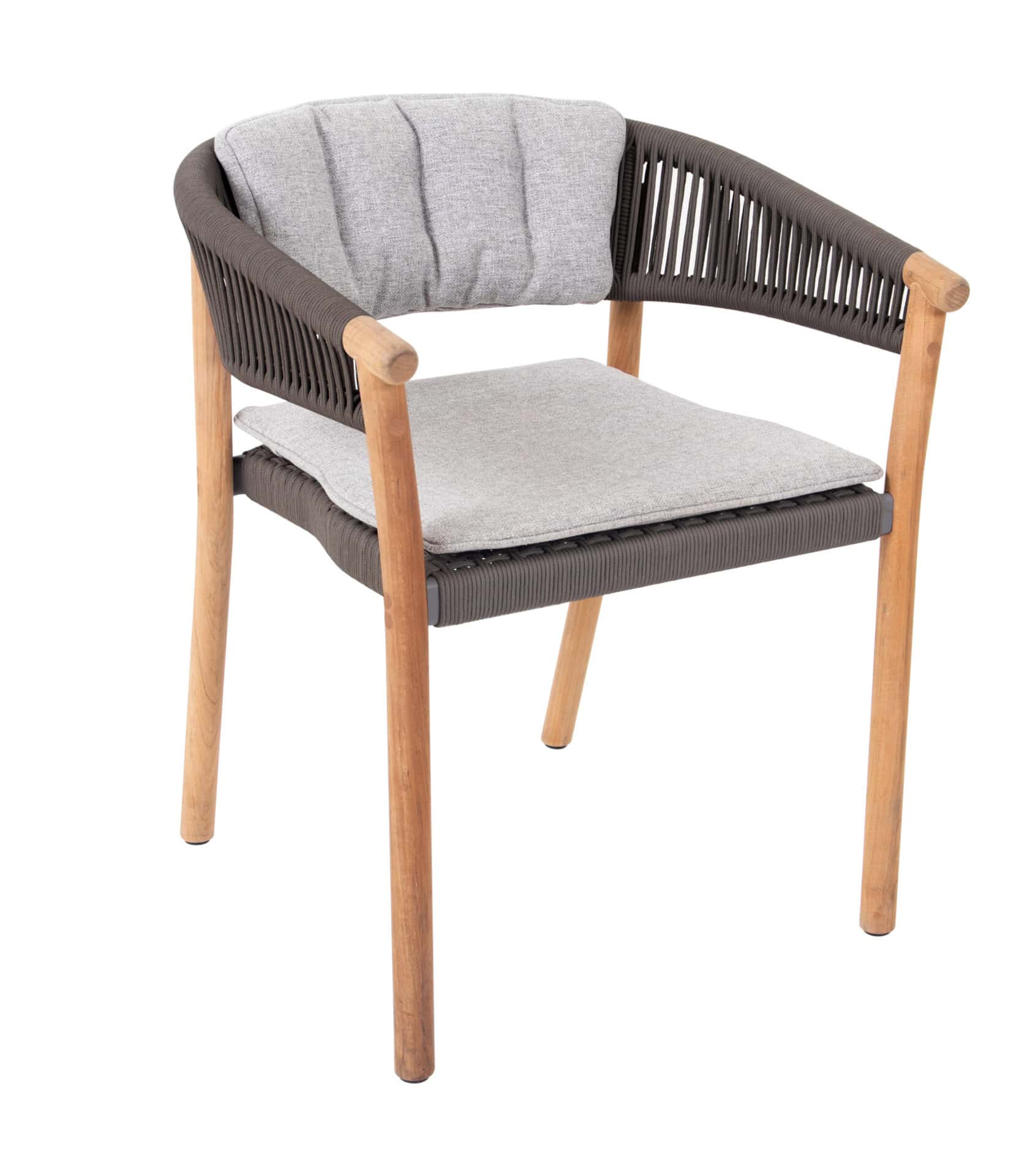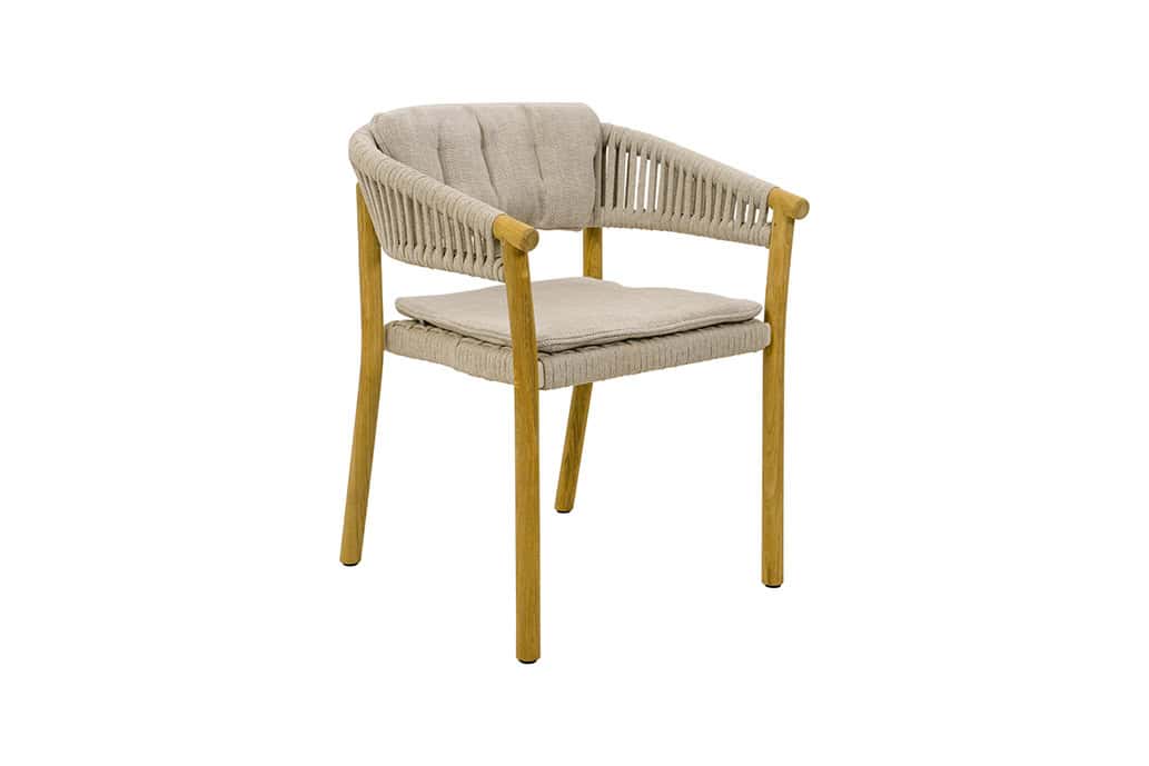 De Marcella armstoel is een combinatie van een rope met een teak frame. De stoel komt standaard met een zit- en rugkussen.