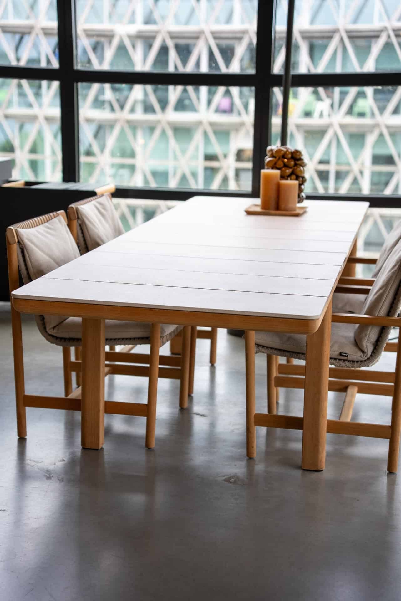 Less is more – en de Amanu tafel van Tribù bewijst het. Deze prachtige tafel van maar liefst 290 cm lang is een toonbeeld van rust, ruimte en verfijning. Met een warm teakhouten frame en een stijlvol keramisch blad in de kleur Sabbia, straalt deze set pure klasse uit.