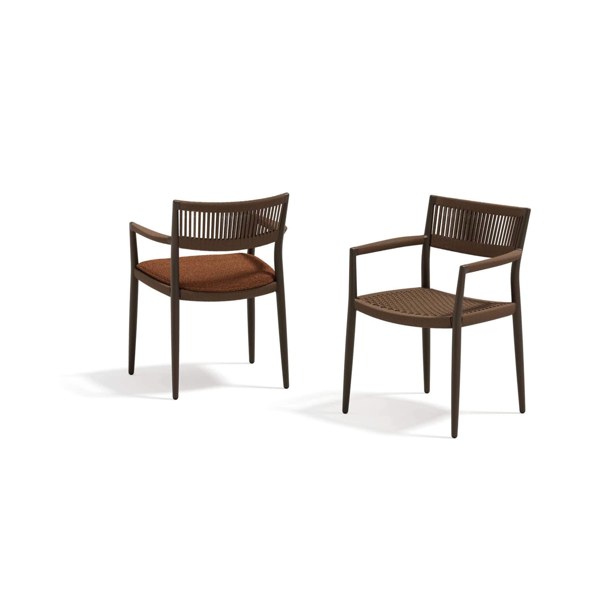 De armchair is opgebouwd uit een lichtgewicht, gepoedercoat aluminium frame dat zorgt voor optimale stabiliteit en weerbestendigheid. Het elegante geweven rugdetail geeft de stoel een warme en ambachtelijke uitstraling, terwijl de strakke lij