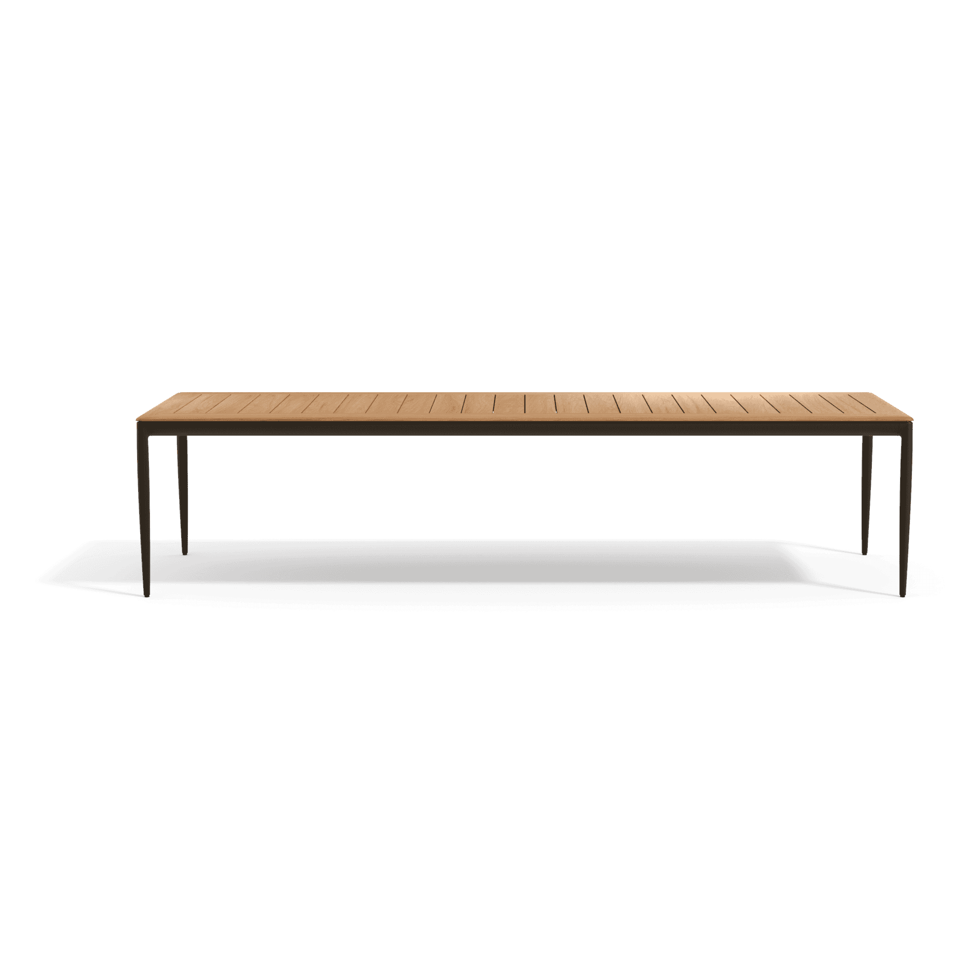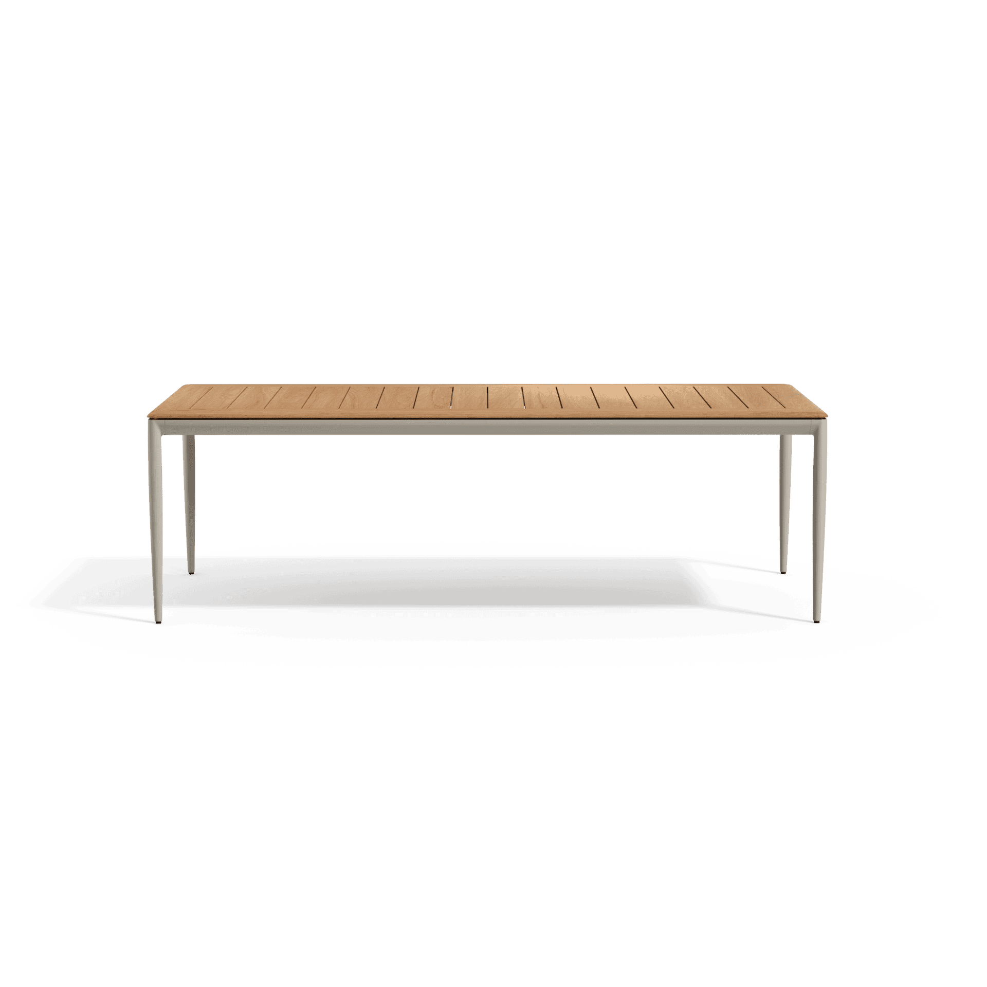 Deze Nagomi dining table combineert een warm teakhouten tafelblad met een stevig aluminium onderstel. De combinatie van natuurlijke materialen en modern frameconcept zorgt voor een luxe uitstraling zonder dat je inlevert op