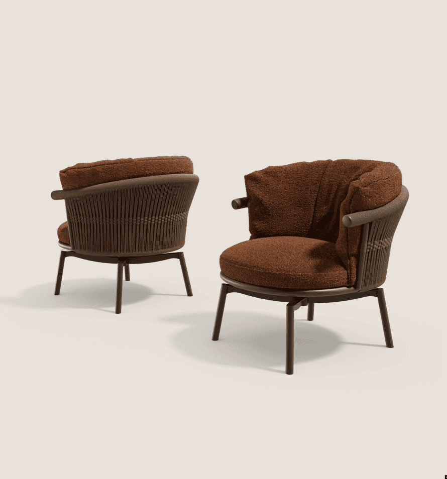 - Details als schouderlijnen en vloeiende esthetiek: stoelen met verjongde rugleuning, armleuningen zacht gebogen, zittingen verdiept, waardoor de meubels een bijna “ingebedden” zitervaring geven.