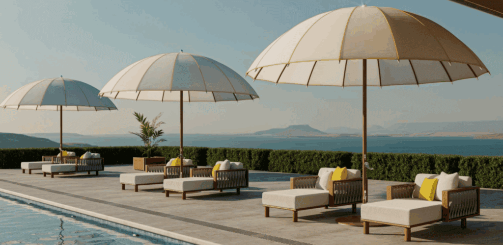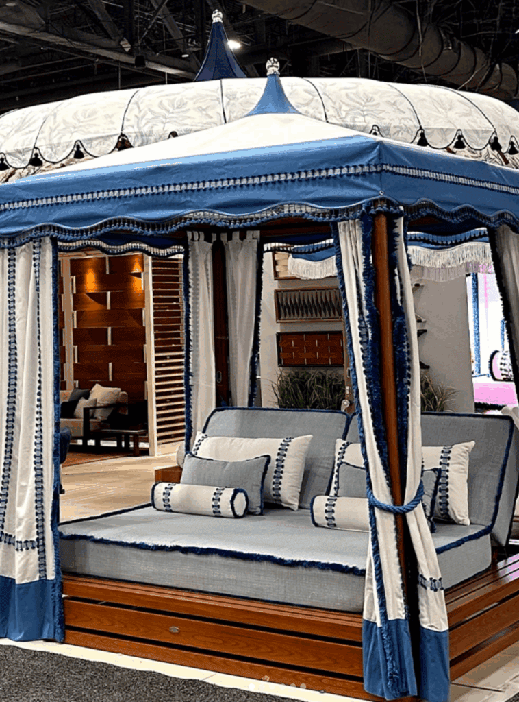 - Zwenkbare loungers / daybeds: grote daybeds met luifel, half-open doek of kap, vaak rond of ovaal van vorm.