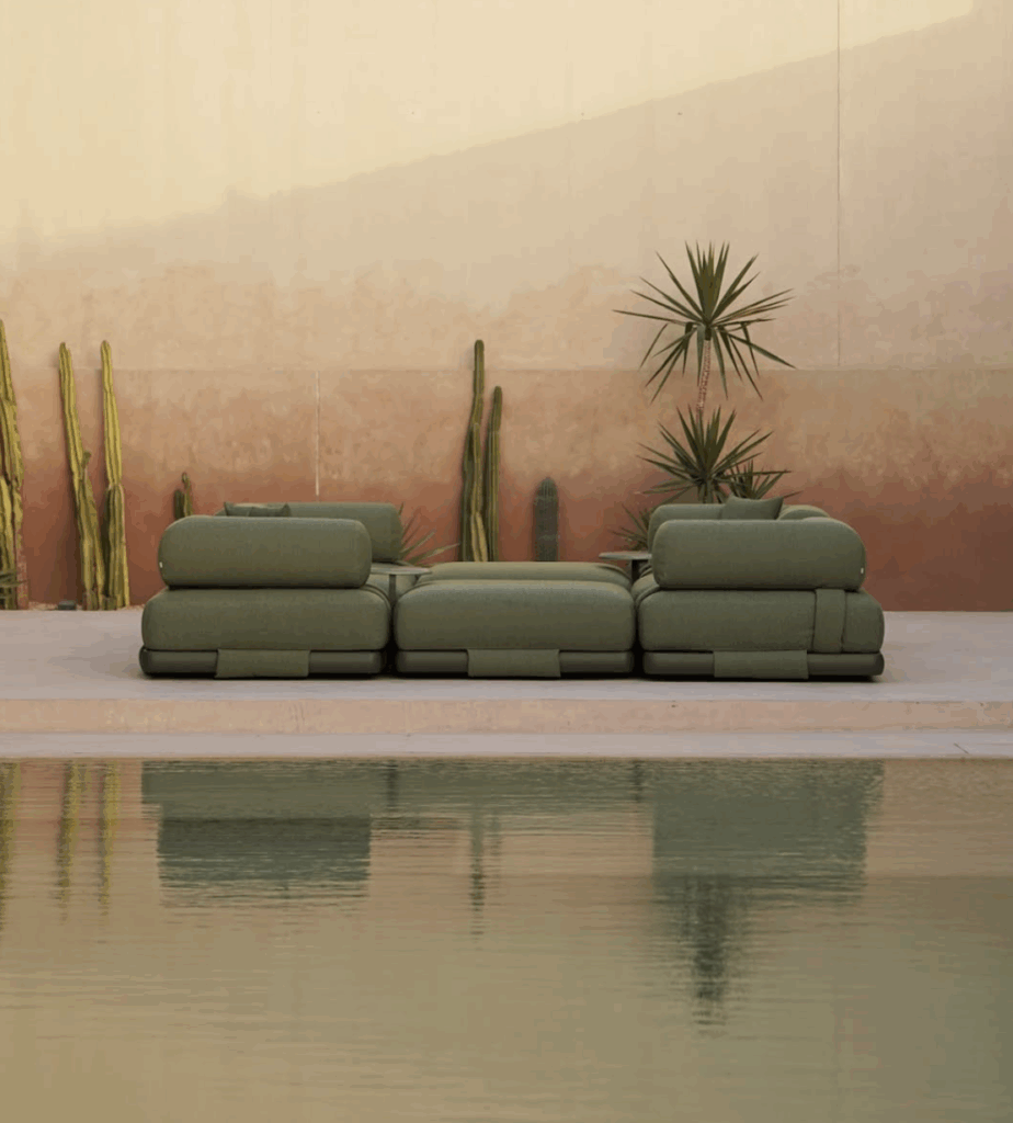 - Curved lounge sets: loungesets met ronde vormen die uitnodigen tot samenzitten, circular seating, gebogen hoekbanken.